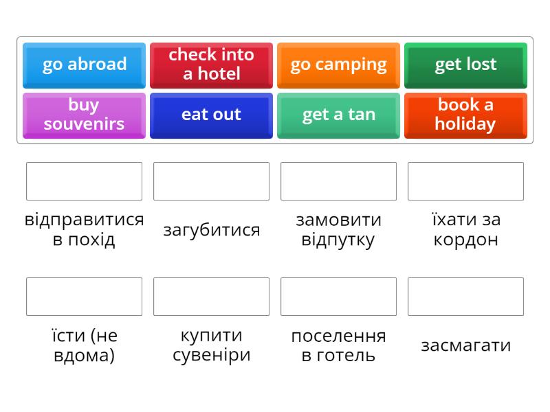 book a holiday - замовити відпутку, buy souvenirs - купити сувеніри, check into a hotel - поселення в готель, eat out - їсти (не вдома), get a tan - засмагати, get lost - загубитися, go abroad - їхати за кордон, go camping - відправитися в похід,