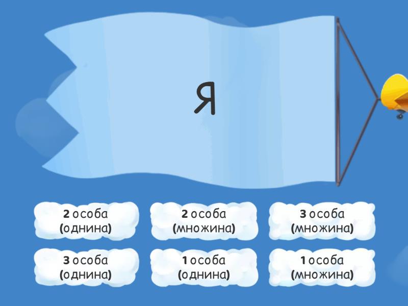 1 особа (однина) - Я, 2 особа (однина) - Ти, 1 особа (множина) - Ми, 2 особа (множина) - Ви, 3 особа (однина) - Він, вона, воно, 3 особа (множина) - Вони,
