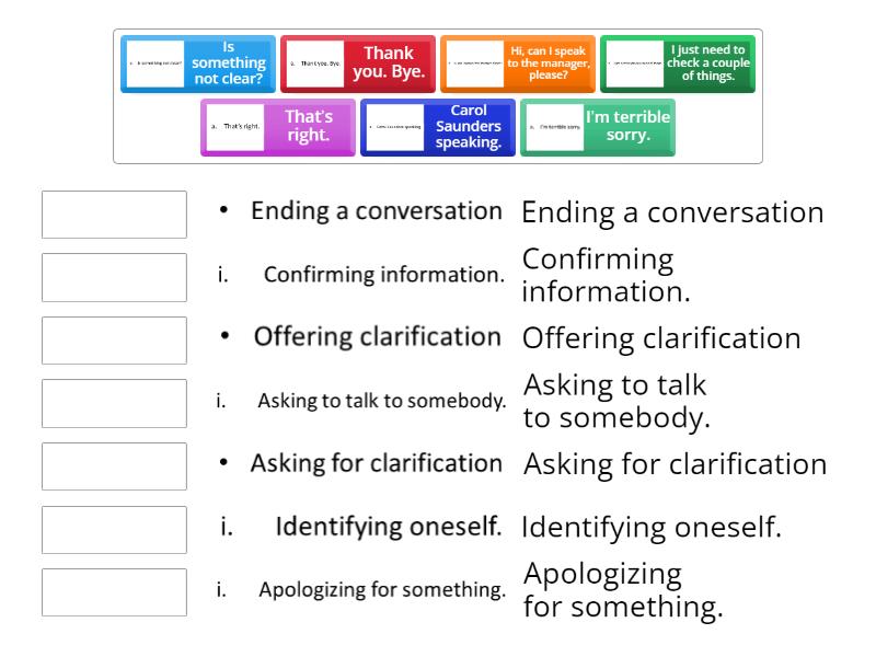 Hi, can I speak to the manager, please? - Asking to talk to somebody., I just need to check a couple of things. - Asking for clarification, I’m terrible sorry. - Apologizing for something., Is something not clear? - Offering clarification, Thank you. Bye. - Ending a conversation, That’s right. - Confirming information., Carol Saunders speaking. - Identifying oneself.,