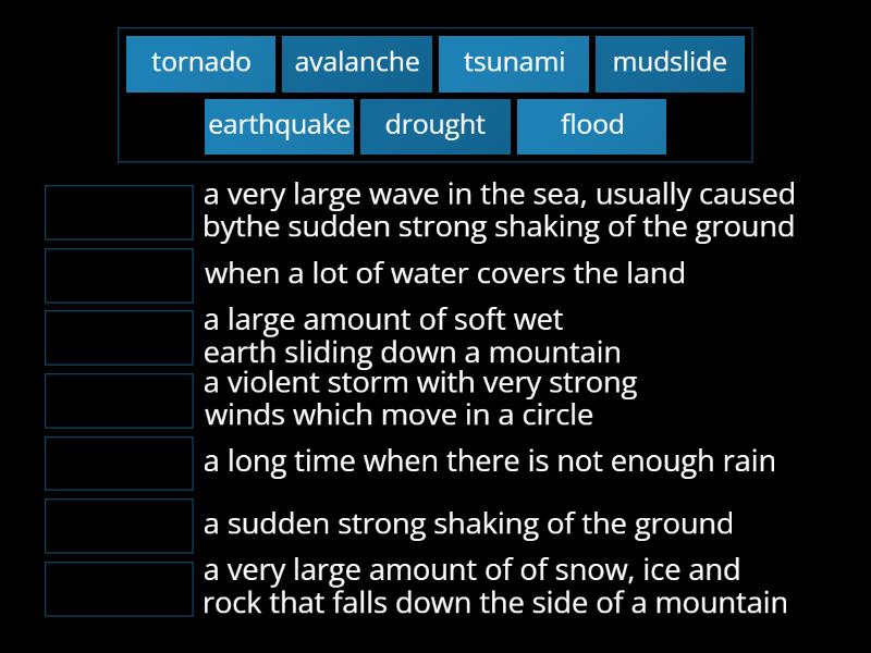 avalanche - a very large amount of of snow, ice and rock that falls down the side of a mountain, drought - a long time when there is not enough rain, earthquake - a sudden strong shaking of the ground, flood - when a lot of water covers the land, mudslide - a large amount of soft wet earth sliding down a mountain, tornado - a violent storm with very strong winds which move in a circle, tsunami - a very large wave in the sea, usually caused bythe sudden strong shaking of the ground,
