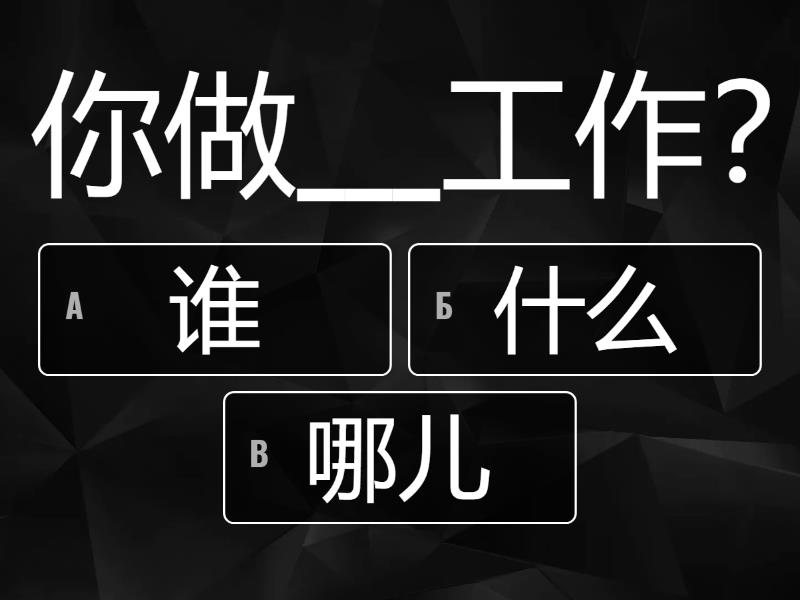 1) 你做___工作? a) 谁 b) 什么 c) 哪儿 2) 你是不是外语学院___学生? a) 的 b) 有 c) 跟 3) 你不给我十二块钱,我___您两块钱 a) 找 b) 说 c) 有 4) 朋友,外语学院___哪儿? a) 有 b) 去 c) 在 5) 我常常在这儿___音乐光盘 a) 有 b) 买 c) 做 6) 请问,这个汉语___说? a) 什么 b) 怎么 c) 多少 7) 师傅,香蕉___钱一斤? a) 什么 b) 几 c) 多少 8) 这儿没有书,___没有本子 a) 也 b) 和 c) 再 9) 你___我学:这叫苹果。 a) 和 b) 跟 c) 有 10) 三斤苹果和一斤香蕉___多少钱? a) 买 b) 是不是 c) 一共