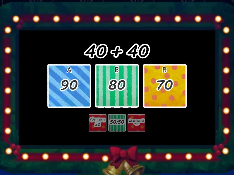 1) 40 + 40 a) 90 b) 80 c) 70 2) 50 - 30 a) 10 b) 20 c) 30 3) 30 + 30 a) 60 b) 70 c) 80 4) 90 - 50 a) 20 b) 30 c) 40 5) 50 + 50 a) 80 b) 90 c) 100 6) 100 - 30 a) 70 b) 60 c) 50 7) 70 + 20 a) 80 b) 90 c) 100 8) 60 - 10 a) 50 b) 40 c) 30 9) 20 + 80 a) 90 b) 100 c) 70 10) 100 - 1 a) 90 b) 89 c) 99 11) 40 + 60 a) 100 b) 90 c) 80 12) 100 - 100 a) 1 b) 10 c) 0