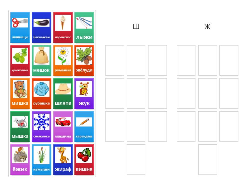 Ш: вишня, камыши, карандаш, машина, мешок, мишка, ромашка, шляпа, мышка, рубашка, Ж: баклажан, ёжик, жёлуди, жираф, снежинка, жук, крыжовник, лыжи, мороженое, ножницы,