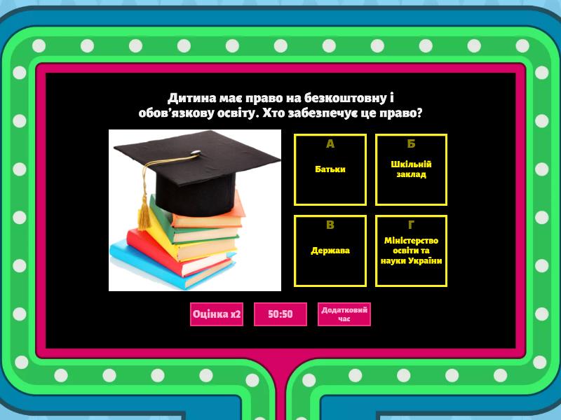 1) Дитина має право на безкоштовну і обов'язкову освіту. Хто забезпечує це право? a) Батьки b) Шкільній заклад c) Держава d) Міністерство освіти та науки України 2) Який міжнародний правовий акт називається світовою Конституцією прав дитини? a) Цивільний кодекс України b) Конвенція ООН про права дитини c) Документ зі служби у справах дітей d) Конституція України 3) Якою є тривалість здобуття початкової освіти? a) 3 роки b) 4 роки c) 5 років d) 9 років 4) Освіта має бути спрямована на .... a) Дистанційне навчання b) Навчальні досягнення c) Повний розвиток людської особи і збільшення поваги до прав і основних свобод d) Безоплатність 5) «Освіта розвиває впевненість у собі, дає...» a) Навички та знання b) Ствердитися у суспільстві c) Фізичний розвиток d) Зверхність над неосвіченими 6) Що належить до обов'язків здобувачів освіти? a) Участь у громадському самоврядуванні та управлінні закладам освіти b) Навчання впродовж життя та академічну мобільність c) Виконувати вимоги освітньої програми, дотримуватись принципу академічної доброчесності, 7) Хто є учасниками освітнього процесу? a) Педагоги b) Усі мешканці мікрорайону c) Здобувачі освіти; педагогічні працівники; батьки 8) Нa яких рівнях здобувається повна загальна середня освіта? a) Початкова, базова середня, профільна, позашкільна освіта b) Дошкільна, початкова, базова середня, профільна c) Початкова, базова середня, профільна d) Дошкілька, повна загальна середня освіта, позашкільна освіта