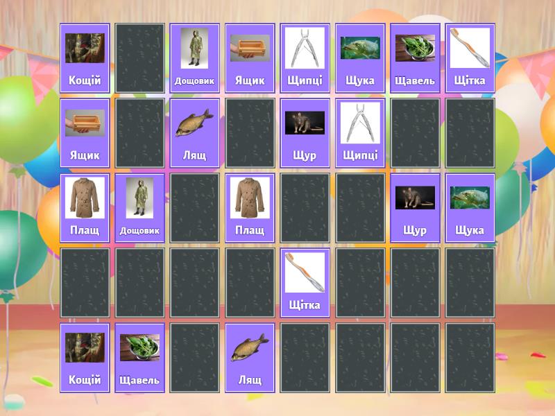 Ящик, Щука, Плащ, Дощовик, Кощій, Щітка, Щипці, Щур, Лящ, Щавель, Гуща, Щит, Хрущ, Кліщ, Ліщина, Дощ, Кущ, Борщ, Плющ, Тріщина,