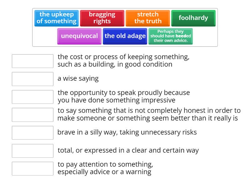 unequivocal - total, or expressed in a clear and certain way, the upkeep of something - the cost or process of keeping something, such as a building, in good condition, foolhardy - brave in a silly way, taking unnecessary risks, the old adage - a wise saying, Perhaps they should have heeded their own advice. - to pay attention to something, especially advice or a warning, stretch the truth - to say something that is not completely honest in order to make someone or something seem better than it really is, bragging rights - the opportunity to speak proudly because you have done something impressive,