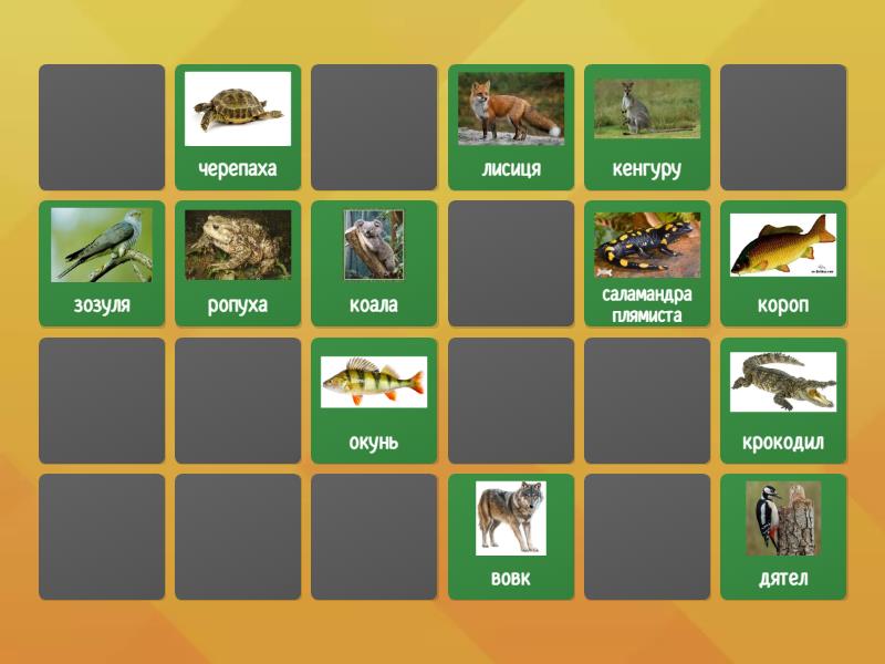 вовк - лисиця, зозуля - дятел, крокодил - черепаха, ропуха - саламандра плямиста, короп - окунь, коала - кенгуру, акула - скат, амеба - інфузорія, дощовий черв"як - п"явка, бджола - муха, павук - кліщ, рак - краб,