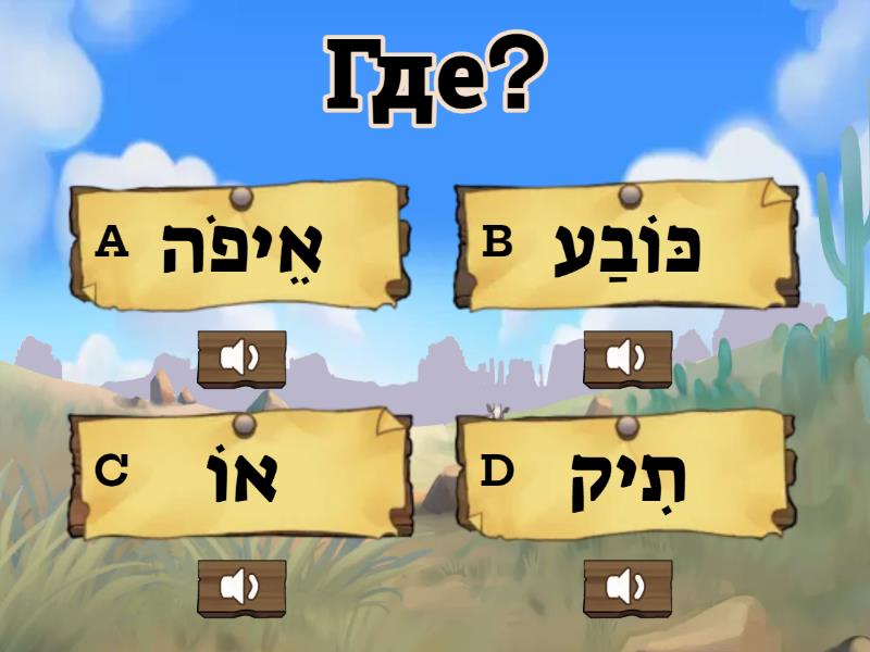 1) Где? a) אֵיפֹה b) כּוֹבַע c) אוֹ d) תִיק 2) Кто? a) בּ b) שִׁיעוּר c) תִיק d) מִי 3) Что? a) תַלמִיד b) זֶה c) אֵיפֹה d) מָה 4) Урок a) שִׁיעוּר b) מוֹרָה c) שֶׁלִי d) אֵיפֹה 5) Учитель (м) a) מוֹרֶה b) שִׁיעוּר c) כּוֹבַע d) תַלמִידָה 6) учительница a) אוֹטוֹ b) מוֹרָה c) זֶה d) שֶׁלִי 7) Ученик (м) a) תַלמִיד b) מִי c) בּ d) תַלמִידָה 8) Ученица a) מָה b) תַלמִידָה c) שִׁיעוּר d) בַּקבּוּק 9) Мой, моя, мои a) בַּיִת b) מוֹרֶה c) בּ d) שֶׁלִי 10) Это a) תַלמִיד b) כּוֹבַע c) דִירָה d) זֶה 11) В (внутри) a) בּ b) תַלמִיד c) מָה d) מַיִם 12) или a) אוֹ b) בַּיִת c) שִׁיעוּר d) כּוֹס 13) Бутылка a) בַּקבּוּק b) תַלמִיד c) שֶׁלִי d) מִי 14) стакан a) כּוֹס b) אוֹטוֹ c) אוֹ d) תִיק 15) вода a) בַּקבּוּק b) מָה c) מַיִם d) אוֹ 16) Шапка, кепка, шляпа a) בּ b) בַּקבּוּק c) מָה d) כּוֹבַע 17) Сумка a) תִיק b) שִׁיעוּר c) כּוֹס d) כּוֹבַע 18) Дом a) בּ b) כּוֹבַע c) שֶׁלִי d) בַּיִת 19) Квартира a) בַּיִת b) אוֹטוֹ c) בּ d) דִירָה 20) Машина a) זֶה b) אוֹטוֹ c) תַלמִידָה d) דִירָה