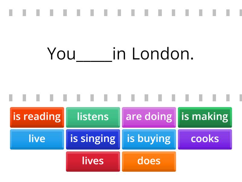 live - You_____in London., lives - She______in Paris., does - He_____his homework., is making - He______dinner now., are doing - They_____housework at the moment, is singing - Look! She_____a song., listens - He_____to music every day., is reading - She_____a book now., cooks - He______in the kitchen., is buying - She_____a new dress for next party.,