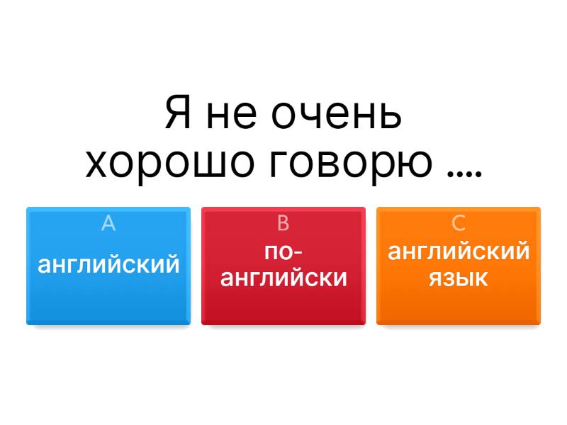 1) Я не очень хорошо говорю .... a) английский b) по- английски c) английский язык 2) Автор книги - известный .... a) историк b) история c) исторический 3) Мой друг Владимир - ..... a) москвич b) москвичка c) московский 4) Скажите, как .... эти цветы? a) зовут b) называются c) звать 5) В этом университете есть ..... факультет? a) экономика b) экономист c) экономический 6) После урока я пойду .... a) в доме b) дома c) домой 7) ..... я отдыхаю. a) Вечер b) Вечером c) Вечерний 8) Я не .... по-китайски a) знаю b) умею c) понимаю 9) Раньше Том всегда .... в столовой. a) завтра b) завтрак c) завтракал 10) Мой брат уже ..... в институте a) учит b) учится c) изучает 11) .... студенты - иностранцы a) Это b) Эти c) Эта 12) Я забыла .... имя. a) ваш b) ваша c) ваше 13) Сколько стоит .... тетрадь ? a) это b) эта c) этот 14) Здесь живут .... друзья a) мой b) моя c) мои 15) Я читаю очень ... рассказ a) интересный b) интересная c) интересное 16) У меня есть друг. .... зовут Джонатан. a) Его b) Её c) их 17) Вы .... книгу "Анна Каренина" a) читал b) читала c) читали 18) Где .... твоя сестра? a) живёт b) живут c) живёшь 19) В субботу .... дождь a) был b) была c) было 20) Скоро у нас ... каникулы a) быть b) будет c) будут 21) Марии нет на уроке, потому что она ...... a) болен b) больна c) больны 22) В комнате два стула и ..... кресло a) один b) одна c) одно 23) Мою подругу зовут .... a) Таня b) Таню c) Тане 24) Скажите, пожайлуста , где кабинет ..... a) директор b) директора c) директору 25) Я купил подарок ..... a) брат b) брате c) брату 26) Завтра мы идём .... a) на концерт b) с концерта c) на концерте 27) Я люблю пить кофе ..... a) в молоке b) с молоком c) молоко 28) В учебнике есть текст .... a) с Москвой b) о Москве c) Москвы 29) Лев Толстой - .... a) писатель b) писателя c) писателем 30) У меня нет ..... a) ручка b) ручки c) ручке 31) Сколько лет ..... ? a) Владимиру b) Владимира c) у Владимира 32) .... зовут Анна a) Эта девочка b) Этой девочки c) Эту девочку 33) Антон гуляет в парке .... a) сына b) с сыном c) к сыну 34) Мы ездили в магазин .... a) автобус b) с автобусом c) на автобусе 35) Где находится .... ? a) Санкт- Петербург b) Санкт-Петербурга c) Санкт- Петербургу 36) Эта книга стоит 104 .... a) рубль b) рублей c) рубля 37) ... надо купить англо- русский словарь a) ты b) тебя c) тебе 38) Дай мне, пожалуйста, .... a) карандаш b) карандаша c) карандашу 39) Я хочу быть ... a) филолог b) филологу c) филологом 40) Недавно наша группа была ... a) экскурсия b) с экскурсией c) на экскурсии 41) Сегодня у меня .... a) день рождения b) дня рождения c) с днём рождения 42) Эти студенты приехали ... a) в Африке b) из Африки c) к Африке 43) Мартин идёт .... a) к врачу b) врача c) у врача 44) Мой брат стал .... a) журналист b) журналиста c) журналистом 45) Студенты- иностранцы живут .... a) в гостинице b) в гостиницу c) с гостиницей 46) У нас в городе есть ... a) река b) реку c) реке 47) У меня есть два ..... и сестра a) брат b) брата c) брату 48) Ты часто звонишь .... a) мама b) мамы c) маме 49) Я часто обедаю .... a) кафе b) в кафе c) с кафе 50) Моя сестра будет ... a) артистка b) артисткой c) артистку 51) Мои родители будут жить в Лондоне ... a) неделя b) неделю c) неделе 52) Вчера было первое ..... a) февраля b) февралю c) февраль 53) Я не был на уроке .... a) пятница b) в пятницу c) пятницы 54) Уже четыре .... . Надо идти домой a) час b) часа c) часу 55) Мы будем изучать .... a) география b) географию c) географии 56) Вы умеете играть ... a) в футбол b) в футболе c) футбол 57) Я мечтаю ... a) машина b) с машиной c) о машине 58) .... нравится ваш преподаватель? a) вы b) вас c) вам 59) Где ты играл .... ? a) Антон b) об Антоне c) с Антоном 60) Мой дядя занимается ..... a) бизнес b) бизнеса c) бизнесом 61) Мне нужно выучить ... . a) этот т