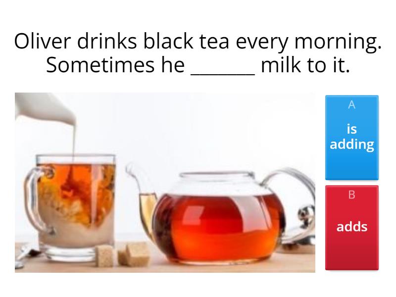 1) Oliver drinks black tea every morning. Sometimes he _______ milk to it. a) is adding b) adds 2) I __________ to temple. I go to church on Sundays. a) don't go b) doesn't go 3) The dentist __________ her teeth right now. a) checks b) is checking 4) John and I ___________ out in the gym now. a) are working b) work 5) We ___________ use plastic bags or straws very often. We need to protect the earth. a) don't use b) doesn't use 6) My job is very interesting. I __________ a lot of people every day. a) meet b) meets 7) My brother ____________ library books on time. a) don't return b) doesn't return 8) Leo n ___________ the truth right now. He lies all the time. a) doesn't tell b) isn't telling 9) Camels ___________ in the Arctic. They live in deserts. a) don't live b) doesn't live 10) My dad __________ outdoor activities, including snowboarding and skiing. a) love b) loves 11) This coffee shop __________ tasty muffins and croissants. a) sell b) sells 12) Look! The spider ___________up the wall. a) is crawl b) crawls 13) The dog __________ at strangers at this moment.  a) barks b) is barking 14) The sun __________ in the west. a) don't rise b) doesn't rise 15) Jessica is an English teacher. She __________ math to children. a) don't teach b) doesn't teach 16) The moon ___________ around the earth and the earth orbits the sun. a) go b) goes 17) Hedgehogs usually __________ in winter. a) hibrernate b) hibernates 18) Rice _______ grow in cold climates. a) don't grow b) doesn't grow 19) The weather here is usually nice. It __________a lot. a) don't rain b) doesn't rain 20) I _________ your phone number, so I can't call you. a) don't know b) doesn't know 21) Andy __________ a car, but he doesn't drive it very often. a) have b) has 22) The aquarium ________ at 5 o'clock in the afternoon. a) close b) closes 23) The shoes in this shop are expensive. They ________ a lot of money. a) cost b) costs 24) I __________ a message to my boyfriend at this moment. a) send b) am sending 25) Bad driving __________ many accidents. a) causes b) cause