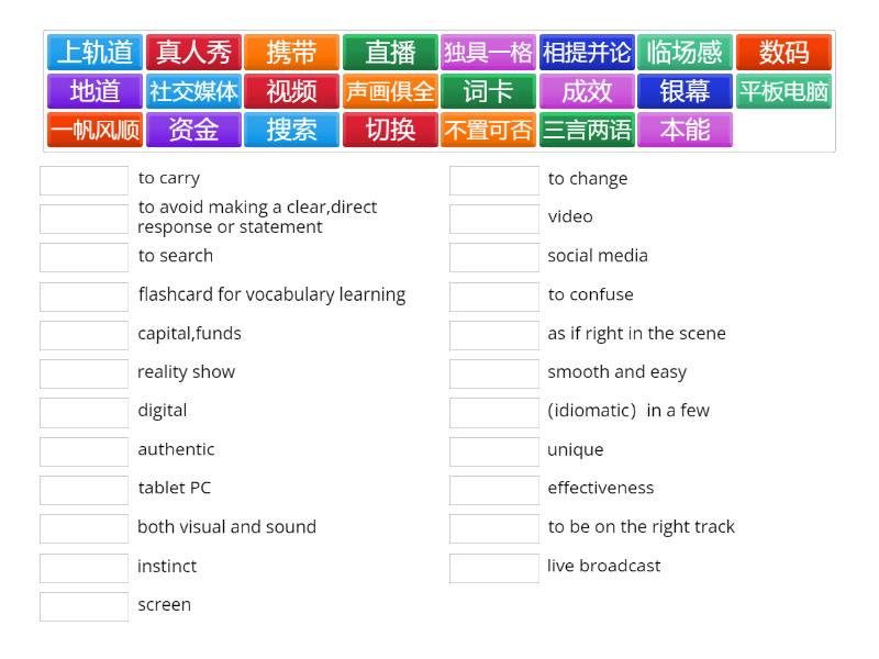 社交媒体 - social media, 三言两语 - (idiomatic)in a few, 真人秀 - reality show, 地道 - authentic, 搜索 - to search, 视频 - video, 词卡 - flashcard for vocabulary learning, 平板电脑 - tablet PC, 成效 - effectiveness, 本能 - instinct, 携带 - to carry, 数码 - digital, 声画俱全 - both visual and sound, 一帆风顺 - smooth and easy, 资金 - capital,funds, 上轨道 - to be on the right track, 相提并论 - to confuse, 独具一格 - unique, 不置可否 - to avoid making a clear,direct response or statement, 银幕 - screen, 直播 - live broadcast, 切换 - to change, 临场感 - as if right in the scene,