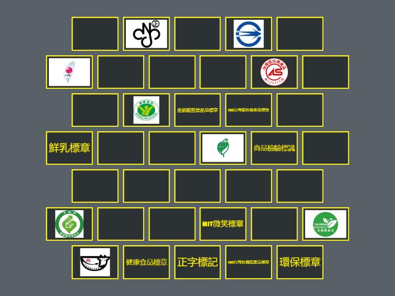 CAS台灣有機農產品標章, 健康食品標章, 環保標章, 鮮乳標章, CAS台灣優良農產品標章, 產銷履歷農產品標章, 商品檢驗標識, 正字標記, MIT微笑標章, 節能標章, 回收標誌, 寧靜標誌, 碳足跡標籤, 普級省水標章, 金級省水標章, 遊戲軟體分級標識, ST 安全玩具標誌, 校園食品標章, 防火標章,