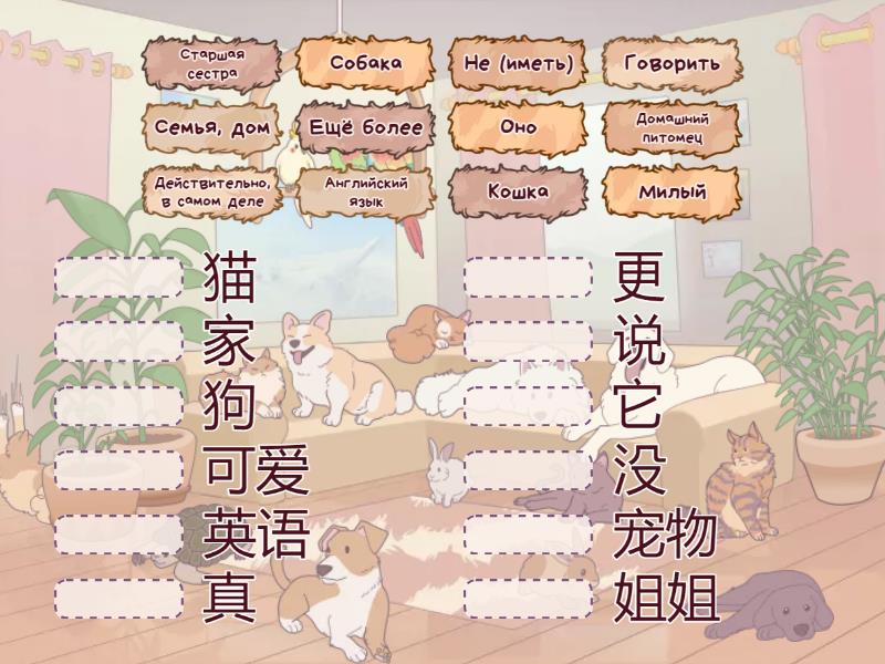 Старшая сестра - 姐姐, Говорить - 说, Английский язык - 英语, Ещё более - 更, Домашний питомец - 宠物, Собака - 狗, Семья, дом - 家, Не (иметь) - 没, Кошка - 猫, Оно - 它, Действительно, в самом деле - 真, Милый - 可爱,