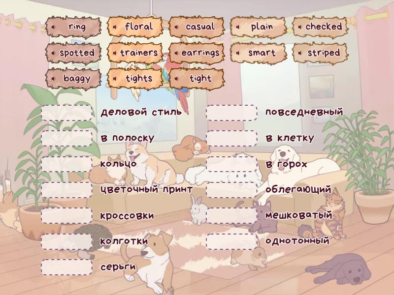 earrings - серьги, ring - кольцо, tights - колготки, trainers - кроссовки, checked - в клетку, floral - цветочный принт, plain - однотонный, spotted - в горох, striped - в полоску, baggy - мешковатый, casual - повседневный, smart - деловой стиль, tight - облегающий,