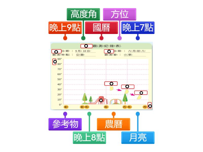 月亮, 國曆, 農曆, 高度角, 方位, 晚上7點, 晚上8點, 晚上9點, 參考物.