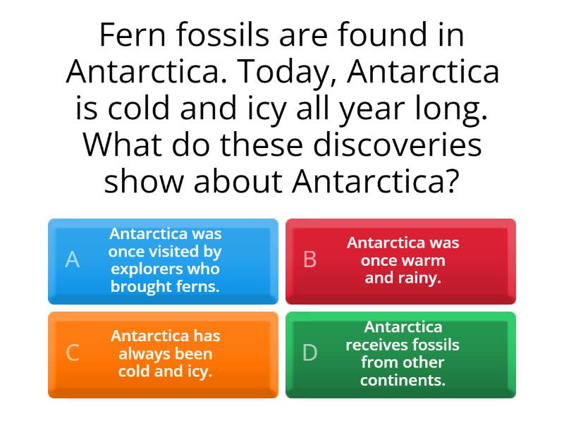 1) Fern fossils are found in Antarctica. Today, Antarctica is cold and icy all year long. What do these discoveries show about Antarctica? a) Antarctica was once visited by explorers who brought ferns. b) Antarctica was once warm and rainy. c) Antarctica has always been cold and icy. d) Antarctica receives fossils from other continents. 2) Which conclusion does the fossil record provide evidence for?  a) Environments and organisms have changed many times throughout Earth's long history. b) Throughout Earth's long history both environments and organisms have changed many times throughout Earth's long history. c) Organisms have changed many times in environments in both land and water. d) All of the above. 3) When were dinosaurs alive? a) between 400 and 1,000 years ago b) between 1,000 and 2,000 years ago c) many milions of years ago d) throughout Earth's history, but not the past 1,200 years 4) What is the value of the evidence that fossils provide? Select all that apply. a) Fossils show the kinds of plants and animals of the distant past. b) Fossils show the environments of the distant past. c) Fossils show that all animals were alive together at the same time. d) Fossils show that Earth has remained about the same over time. e) Fossils show how organisms have changed over time. 5) Which statements about Earth are supported by fossil evidence? Select all that apply. a) All animals were alive together at the same time. b) Some animals of the past are no longer alive today. c) Earth's environments have changed over time. d) Some animals of the present were not alive in the distant past. e) Animals have changed only slightly throughout Earth's history. 6) Are fossils the only evidence that dinosaurs and other ancient organisms ever existed? Why? a) Yes. Humans were not yet alive when these organisms existed. b) No. Reports in books and science journals provide additional evidence. c) No. Sculptures at museums and zoos provide additional evidence. d) Maybe. Scientists think that other types of evidence may exist. 7) Scientists have discovered many fossils of trilobites, a type of sea animal. Could scientists study other evidence to learn more about trilobites? a) No. Trilobites went extinct long before humans lived. b) No. Living trilobites are too active to study. c) Yes. Scientists could study living trilobites instead. d) Yes. Scientists could study photographs or drawings of trilobites. 8) A team of scientists writes a report about a fossil dig. The team concludes that the fossils came from a warm, rainy environment. Which evidence would most strongly support this conclusion? a) The dig site has a warm, rainy climate today. b) Tree roots were found in the upper soil at the dig site. c) The fossils were warm and damp when they were discovered. d) Several fern fossils were discovered at the dig site. 9) How could an imprint fossil form? a) Plant leaves were pressed into hardening sediment. b) A bone was gradually replaced with rock. c) An insect was trapped in tree sap. d) The body of a snail rotted away, and minerals filled the empty space. 10) How could a cast fossil form? a) A bone was gradually replaced with rock. b) An insect was trapped in tree sap. c) The body of a snail rotted away, and minerals filled the empty space. d) Plant leaves were pressed into hardening sediment. 11) How quickly must these changes occur for a fossil to form and be discovered? An organism dies and is buried in sediment. a) slow b) fast 12) How quickly must these changes occur for a fossil to form and be discovered? Minerals replace parts of the organism. a) slow b) fast 13) How quickly must these changes occur for a fossil to form and be discovered? Pressure and heat change the minerals into rock. a) slow b) fast 14) How quickly must these changes occur for a fossil to form and be discovered? The fossil is discovered and removed from the ground. a) slow b) fast 15) What type of ancient environment would the fossils of - dinosaurs, ferns, and small mammals - be from? a) cold forest b) wet, swampy forest c) ancient oceans 16) What type of ancient environment would the fossils of - mastodons, woolly mammoths, and other large mammals - be from? a) cold forest b) wet, swampy forest c) ancient oceans 17) What type of ancient environment would the fossils of - fish, corals, clams, sponges, squids - be from? a) cold forest b) wet, swampy forest c) ancient oceans