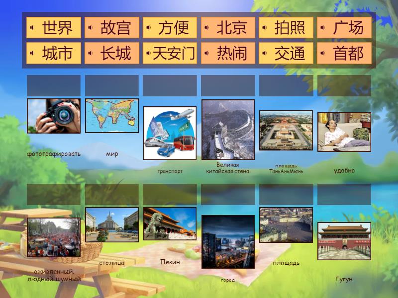 首都 - столица, 城市 - город, 热闹 - оживленный, людный. шумный, 广场 - площадь, 交通 - транспорт, 故宫 - Гугун, 北京 - Пекин, 长城 - Великая китайская стена, 方便 - удобно, 世界 - мир, 拍照 - фотографировать, 天安门 - площадь ТаньАньМынь,