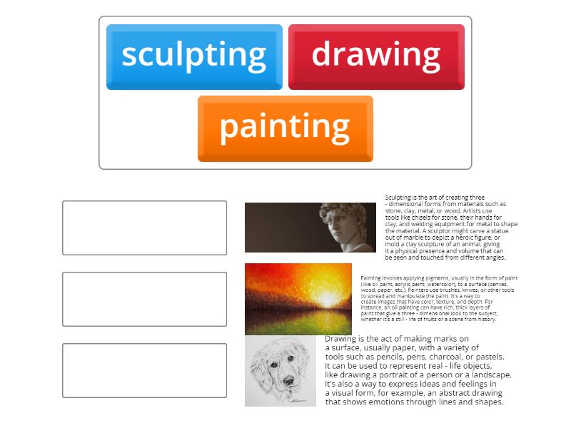 drawing - Drawing is the act of making marks on a surface, usually paper, with a variety of tools such as pencils, pens, charcoal, or pastels. It can be used to represent real - life objects, like drawing a portrait of a person or a landscape. It's also a way to express ideas and feelings in a visual form, for example, an abstract drawing that shows emotions through lines and shapes., painting - Painting involves applying pigments, usually in the form of paint (like oil paint, acrylic paint, watercolor), to a surface (canvas, wood, paper, etc.). Painters use brushes, knives, or other tools to spread and manipulate the paint. It's a way to create images that have color, texture, and depth. For instance, an oil painting can have rich, thick layers of paint that give a three - dimensional look to the subject, whether it's a still - life of fruits or a scene from history., sculpting - Sculpting is the art of creating three - dimensional forms from materials such as stone, clay, metal, or wood. Artists use tools like chisels for stone, their hands for clay, and welding equipment for metal to shape the material. A sculptor might carve a statue out of marble to depict a heroic figure, or mold a clay sculpture of an animal, giving it a physical presence and volume that can be seen and touched from different angles.,