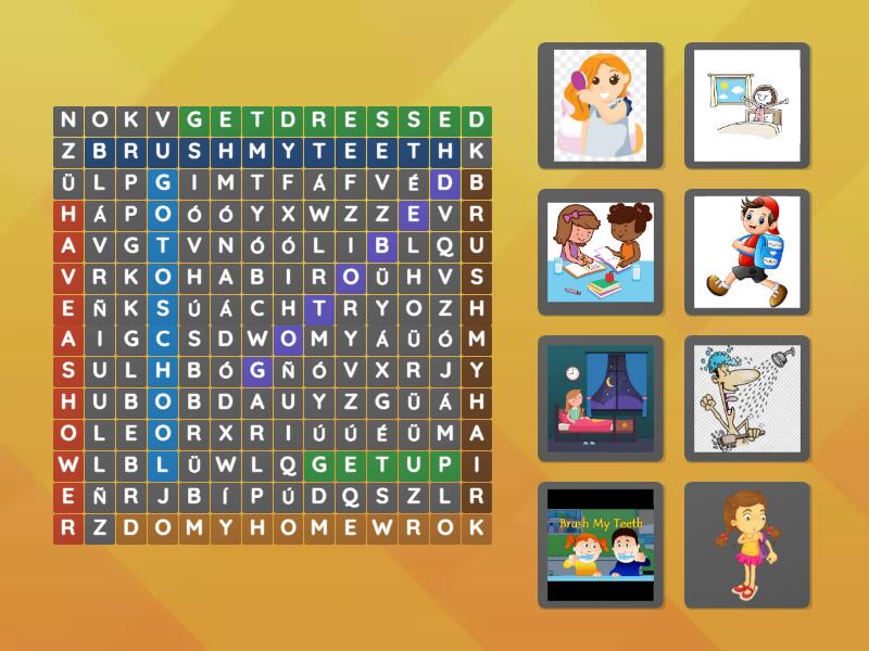 GET DRESSED, GO TO BED, HAVE A SHOWER, GO TO SCHOOL, BRUSH MY HAIR, BRUSH MY TEETH, DO MY HOMEWROK, GET UP,
