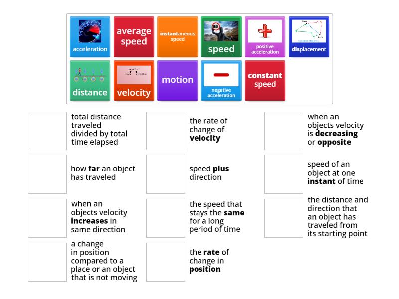 acceleration - the rate of change of velocity, velocity - speed plus direction, distance - how far an object has traveled, instantaneous speed - speed of an object at one instant of time, displacement - the distance and direction that an object has traveled from its starting point, constant speed - the speed that stays the same for a long period of time, speed - the rate of change in position, average speed - total distance traveled divided by total time elapsed, positive acceleration - when an objects velocity increases in same direction, negative acceleration - when an objects velocity is decreasing or opposite, motion - a change in position compared to a place or an object that is not moving,