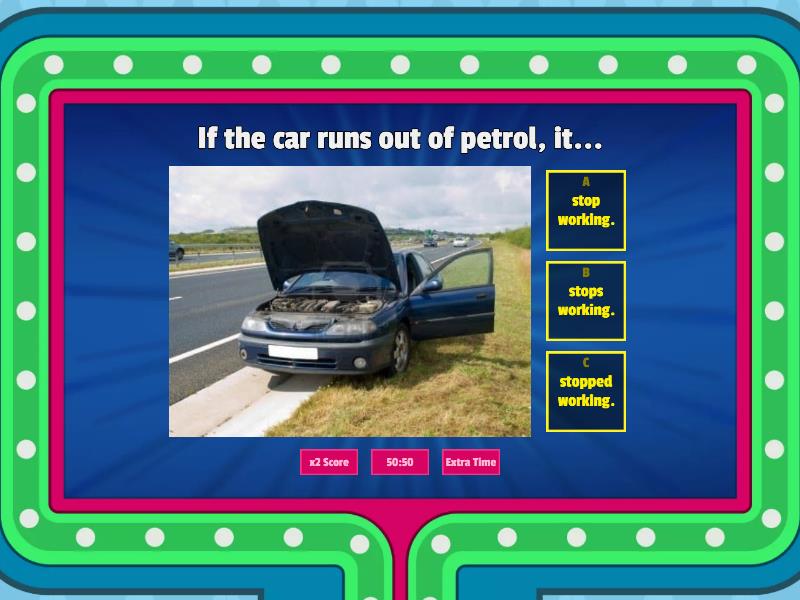 1) If the car runs out of petrol, it... a) stop working. b) stops working. c) stopped working. 2) If there is a big electrical storm, we... a) will not play football outside. b) not play football outside. c) plays football outside. 3) If you miss the bus, you... a) be late for school. b) will be late for school. c) won't are late for school. 4) If you touch the dog while it's eating, it... a) bite you. b) be bite you. c) will bite you. 5) If you feel tired,  a) go to bed early. b) goes to bed early. c) went to bed early. 6) If you are late for work again, your boss... a) get angry. b) will get angry. c) is will angry. 7) If you play the music too loud, your neighbours... a) are complain. b) will be complain. c) will complain. 8) If your cellphone runs out of battery too soon, a) buy a power bank. b) buys a power bank. c) are buy a power bank. 9) If you see smoke coming out of your car, a) stops it immediately. b) you will stops immediately. c) stop it immediately 10) If you mix yellow and blue, you... a) are getting green. b) get green. c) gets green.