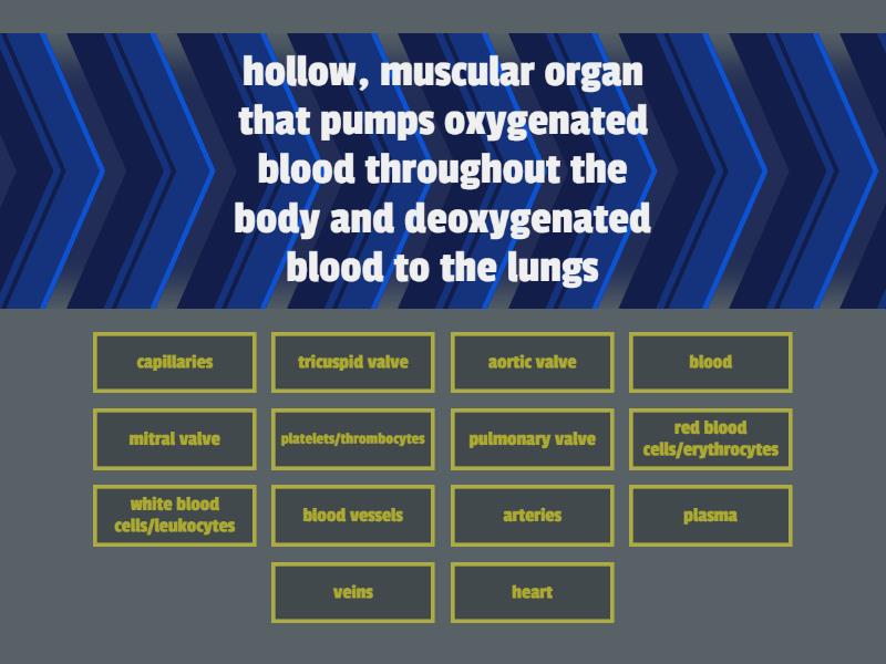 heart - hollow, muscular organ that pumps oxygenated blood throughout the body and deoxygenated blood to the lungs, tricuspid valve - regulates the blood flow between the right atrium and right ventricle, mitral valve - allows oxygen-rich blood from your lungs pass from the left atrium into the left ventricle, aortic valve - manages blood flow from the left ventricle into the aorta, pulmonary valve - manages blood flow out of the right ventricle through the pulmonary trunk into the pulmonary arteries, blood - a fluid that transports oxygen and other essential substances throughout the body, red blood cells/erythrocytes - carry oxygen, nutrients and wastes; produced in the bone marrow; contains hemoglobin, white blood cells/leukocytes - fight diseases and protect the body from infection, plasma - yellowish liquid that carries suspended blood cells and other substances; consists of salts, nutrients, water, electrolytes, enzymes, platelets/thrombocytes - assists in blood clotting, blood vessels - tubes or channels that carry blood throughout our body, arteries - carries blood away from the heart, veins - carries blood back towards the heart, capillaries - assists in the exchange of substances between the blood and tissues; connects arteries and veins,
