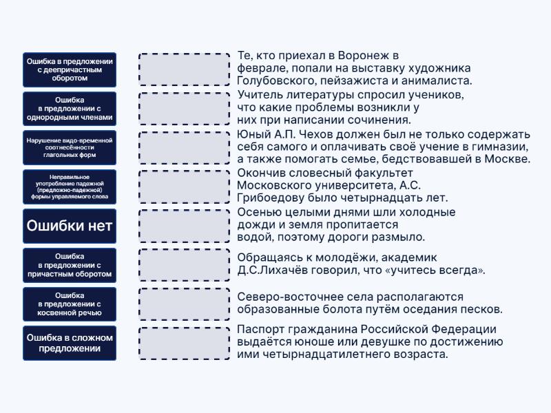 Ошибки нет - Те, кто приехал в Воронеж в феврале, попали на выставку художника Голубовского, пейзажиста и анималиста., Ошибка в сложном предложении - Учитель литературы спросил учеников, что какие проблемы возникли у них при написании сочинения., Ошибка в предложении с однородными членами - Юный А.П. Чехов должен был не только содержать себя самого и оплачивать своё учение в гимназии, а также помогать семье, бедствовавшей в Москве., Ошибка в предложении с деепричастным оборотом - Окончив словесный факультет Московского университета, А.С. Грибоедову было четырнадцать лет., Нарушение видо-временной соотнесённости глагольных форм - Осенью целыми днями шли холодные дожди и земля пропитается водой, поэтому дороги размыло., Ошибка в предложении с косвенной речью - Обращаясь к молодёжи, академик Д.С.Лихачёв говорил, что «учитесь всегда»., Ошибка в предложении с причастным оборотом - Северо-восточнее села располагаются образованные болота путём оседания песков., Неправильное употребление падежной (предложно-падежной) формы управляемого слова - Паспорт гражданина Российской Федерации выдаётся юноше или девушке по достижению ими четырнадцатилетнего возраста.,