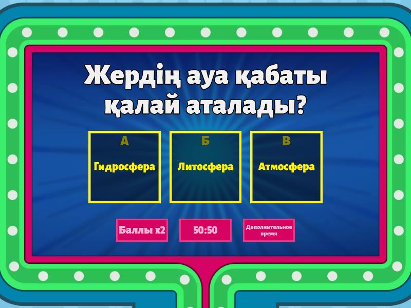 1) Жердің ауа қабаты қалай аталады? a) Гидросфера b) Литосфера c) Атмосфера 2) Атмосфера қабаттарын атаңдар? a) Тропосфера, стратосфера, мезосфера b) Тропосфера, стратосфера, термосфера c) Тропосфера, стратосфера, мезосфера, термосфера,экзосфера 3) Ауаның 80% қай қабатта орналасқан? a) Стратосфера b) Атмосфера c) Тропосфера 4) Тропосферадан кейінгі жоғарда орналасқан қабат қалай аталады? a) Стратосфера b) Тропосфера c) Атмосфера 5) Ауаның температурасын қандай құралмен өлшейді? a) Барометр b) Гидрометр c) Термометр 6) Ауа қысымын қандай құралмен өлшейді? a) Барометр b) Гидрометр c) Термометр 7) Желдің бағытын қандай құралмен өлшейді? a) Гигрометр b) Флюгер c) Барометр 8) Ауаның ылғалдылығын өлшейтін құрал қалай аталады? a) Гигрометр b) Барометр c) Термометр 9) Бұлттан не жауады? a) Жаңбыр, бұршақ, қырау b) Жаңбыр, бұршақ, қар c) Жаңбыр, бұршақ, шық 10) Жер бетіне сұйық кұйде түсетін жауын-шашын. a) жаңбыр b) шық c) қырау
