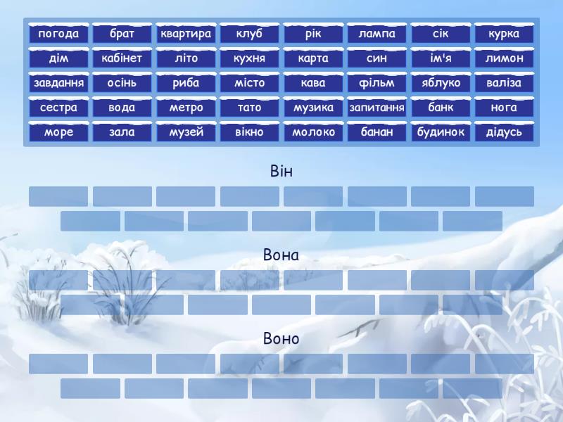 Він: кабінет, тато, лимон, син, банан, брат, дідусь, сік, рік, клуб, фільм, дім, будинок, банк, музей , Вона: кухня, зала, квартира, кава, сестра, музика, осінь, лампа, вода, валіза, карта, нога, курка, погода, риба, Воно: вікно, місто, ім'я, завдання, запитання, яблуко, метро, літо, молоко, море,