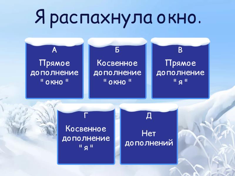 1) Я распахнула окно. a) Прямое дополнение " окно " b) Косвенное дополнение " окно " c) Прямое дополнение " я " d) Косвенное дополнение " я " e) Нет дополнений 2) Морячок играл на гармошке. a) Прямое дополнение " играл " b) Косвенное дополнение " играл " c) Прямое дополнение " на гармошке "  d) Косвенное дополнение " на гармошке " e) Нет дополнений 3) Старуха пряла свою пряжу. a) Прямое дополнение " свою " b) Косвенное дополнение " свою " c) Прямое дополнение " пряжу " d) Косвенное дополнение " пряжу " e) Нет дополнений 4) Учительница посмотрела на нас строго. a) Прямое дополнение " на нас " b) Косвенное дополнение " на нас " c) Прямое дополнение " строго " d) Косвенное дополнение " строго " e) Нет дополнений 5) Я учу очень сложное правило. a) Прямое дополнение " правило " b) Косвенное дополнение " правило " c) Прямое дополнение " очень " d) Косвенное дополнение " очень " e) Нет дополнений 6) Белорусская кухня черезвычайно разнообразна. a) Прямое дополнение " кухня " b) Косвенное дополнение " кухня " c) Прямое дополнение " черезвычайно " d) Косвенное дополнение " черезвычайно " e) Нет дополнений 7) Её значительную часть составляют блюда из картофеля. a) Прямое дополнение " часть " b) Косвенное дополнение " часть " c) Прямое дополнение " из картофеля " d) Косвенное дополнение " из картофеля " e) Нет дополнений 8) Картофель тушат с мясом и грибами. a) Прямое дополнение " картофель " b) Косвенное дополнение " картофель " c) Косвенное дополнение " с мясом " d) Косвенное дополнение " с грибами " e) Нет дополнений