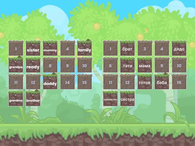family - семейство, mummy - мама, daddy - тати, brother - брат, sister - сестра, grandma - баба, grandpa - дядо, ready - готов, help - помощ, look - виж, circle - кръг, eyes - очи, rectangle - правоъгълник, triangle - триъгълник, square - квадрат, now - сега, good - добър,