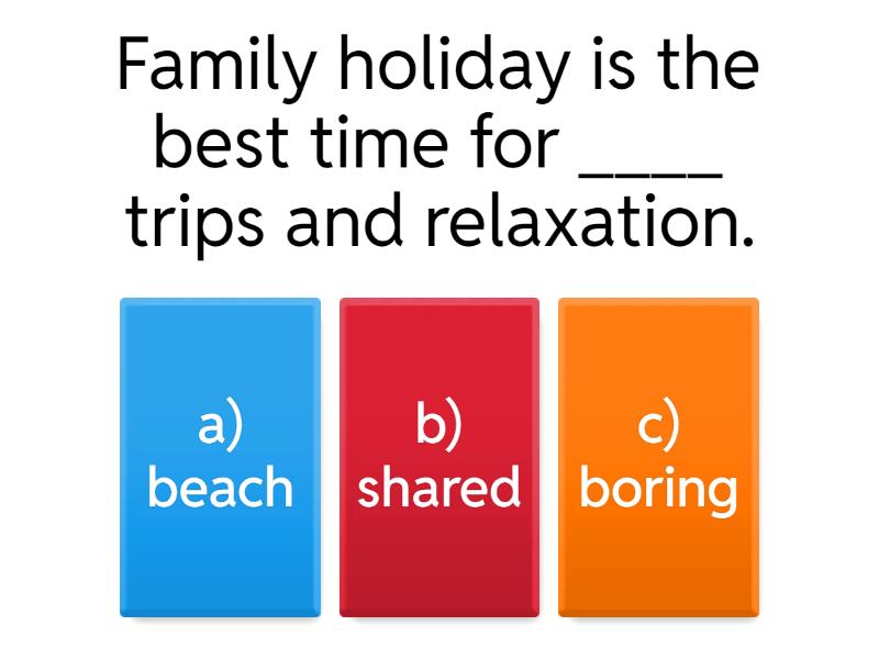 1) Family holiday is the best time for ____ trips and relaxation. a) a) beach b) b) shared c) c) boring 2) 2. Every year we gather for big family ____. a) a) celebrations b) b) fights c) delays 3) 3. Our family loves spending free time in nature during ____. a) a) arguments b) b) vacations c) c) shopping 4) 4. Mom always cooks delicious dishes for family ____. a) a) meetings b) b) holidays c) c) complaints 5) 5. At family gatherings, we discuss ____ and share experiences. a) a) news b) b) silence c) c) weather 6) 6. Every summer we go to the ____, where we spend time together. a) a) mall b) b) cottage c) c) office 7) 7. The children always look forward to holidays to go to the ____. a) a) seaside b) b) desert c) c) city 8) 8. Dad always organizes interesting excursions for the whole ____. a) a) neighborhood b) b) family c) c) company 9) 9. Christmas is the favorite holiday in our ____. a) a) calendar b) b) family c) c) school 10) 10. Family trips strengthen our family ____. a) a) bonds b) b) stress c) c) distances 11) 11. During vacation, we ____ games together. a) a) create b) b) avoid c) c) play 12) 12. Our tradition is to celebrate every birthday of all family ____. a) a) members b) b) strangers c) c) holidays