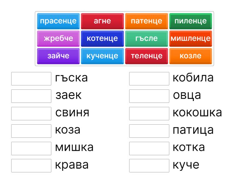 котенце - котка, теленце - крава, мишленце - мишка, пиленце - кокошка, патенце - патица, зайче - заек, кученце - куче, прасенце - свиня, козле - коза, агне - овца, гъсле - гъска, жребче - кобила,