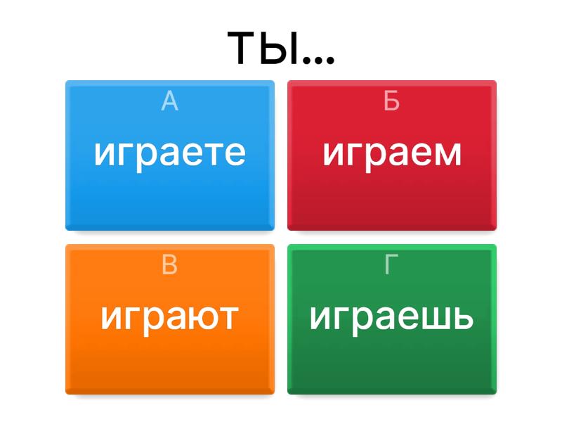 1) ты... a) играете b) играем c) играют d) играешь 2) он, она... a) играет b) играют c) играю 3) я a) учу b) смотри