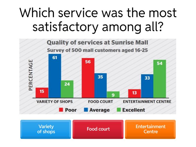 1) Which service was the most satisfactory among all? a) Variety of shops b) Food court c) Entertainment Centre 2) Which service was the least satisfactory among all? a) Food court b) Variety of shops c) Entertainment Centre 3) Which service most participants rate it average? a) Food court b) Variety of shops c) Entertainment Centre