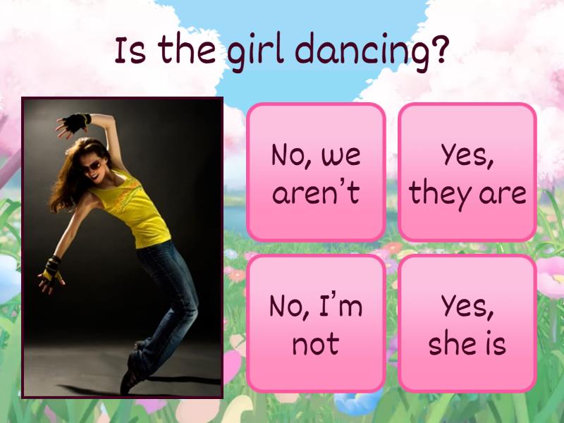 1) Is the girl dancing? a) No, we aren’t b) Yes, they are c) No, I’m not d) Yes, she is 2) Are we playing chess? a) Yes, they are b) No, they aren’t c) No, we aren’t d) No, she isn’t 3) Am I studying English? a) No, they aren’t b) Yes, I am c) No, I’m not d) No, she isn’t 4) Is Liza planting flowers? a) No, she isn’t b) No, it isn’t c) Yes, I am d) Yes, it is 5) Are you washing your T-shirt? a) No, I’m not b) Yes, I am c) Yes, he is d) No, she isn’t 6) Are your grandparents reading newspapers? a) No, they aren’t b) Yes, she is c) Yes, they are d) No, we aren’t 7) Is the cat sleeping? a) No, it isn’t b) Yes, they are c) Yes, I am d) No, we aren’t 8) Are dogs running? a) No, we aren’t b) No, they aren’t c) Yes, I am d) Yes, she is 9) Is Dan listening to music? a) Yes, it is b) Yes, he is c) No, we aren’t d) Yes, I am 10) Is it raining? a) Yes, they are b) Yes, it is c) Yes, he is d) No, she isn’t
