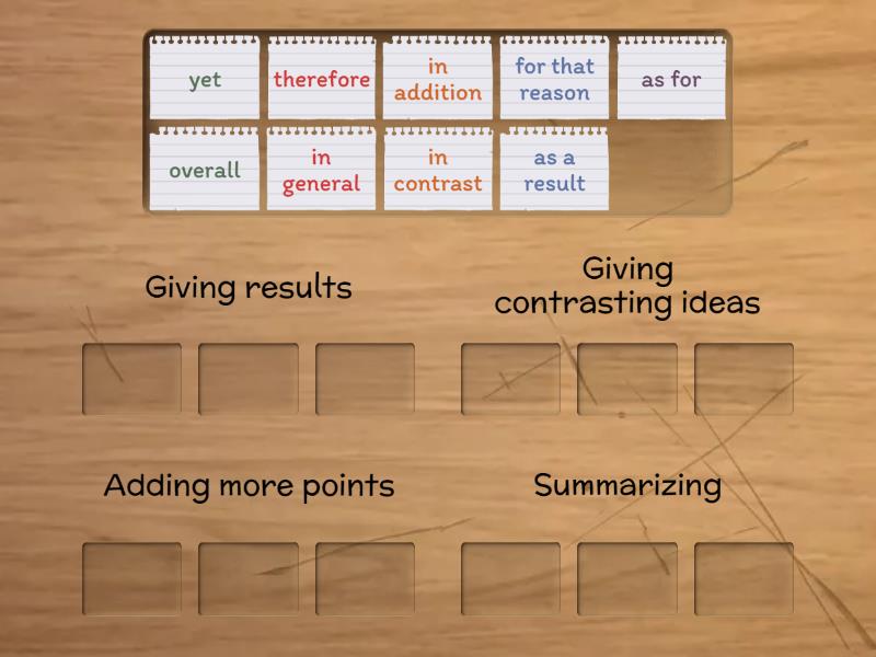 Giving results: therefore, for that reason, as a result, Giving contrasting ideas: yet, in contrast, Adding more points: in addition, as for, Summarizing: in general, overall,