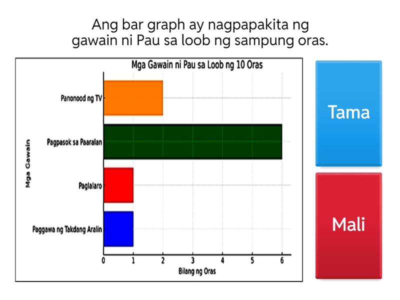 1) Ang bar graph ay nagpapakita ng gawain ni Pau sa loob ng sampung oras. a) Tama b) Mali 2) 7 oras ang ginugugol ni Pau sa paaralan. a) Tama b) Mali 3) Pareho ang oras ng paglalaro at panonood ng TV. a) Tama b) Mali 4) Ang pagpasok sa paaralan ay lamang ng limang oras sa paggawa ng takdang-aralin. a) Tama b) Mali 5) 2 oras ang ginugugol ni Pau sa paglalaro. a) Tama b) Mali