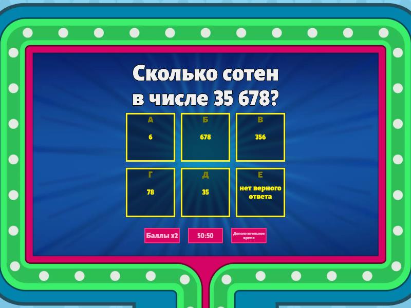 1) Сколько сотен в числе 35 678? a) 6 b) 678 c) 356 d) 78 e) 35 f) нет верного ответа 2) Сколько всего десятков в числе 1392? a) 2 b) 9 c) 3 d) 1 e) 139 f) все верно 3) Чему равна сумма чисел 570 и 430? a) 100 b) 1000 c) 950 d) 1100 e) 1010 f) 1200 4) Чему равна разность чисел 730 и 470? a) 360 b) 240 c) 260 d) 1200 e) 1000 f) 310 5) Во сколько раз 770 больше 11? a) 10 b) 12 c) 14 d) 70 e) 77 f) 17 6) Во сколько раз 3 меньше, чем 870? a) 29 b) 30 c) 290 d) 15 e) 20 f) 25 7) Какое число умножили на 40 и получили 2400? a) 6 b) 24 c) 240 d) 65 e) 60 f) 160 8) Какое число составляет 1/3 от числа 360? a) 1080 b) 357 c) 263 d) 12 e) 100 f) 120 9) Сколько центнеров в 12 т? a) 120 b) 1 200 c) 12 000 d) 120 000 10) В магазине было 600 рулонов обоев. Продали 1/10 часть всех рулонов. Сколько рулонов осталось в магазине? a) 60 b) 660 c) 540 d) 640 e) 500