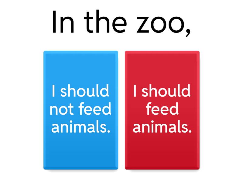 1) In the zoo, a) I should not feed animals. b) I should feed animals. 2) In the zoo, a) I shouldn't follow the rules. b) I should follow the rules. 3) In the hospital, a) I shouldn't shout. b) I should shout. 4) In the hospital, a) I shouldn't run. b) I should run. 5) She has headache.  a) She should not go to the party. b) She should go to the party. 6) He is overweight.  a) He should not eat healthy food. b) He should eat healthy food. 7) In class, a) I should not copy the exam. b) I should copy the exam. 8) Pregnant women ______ smoke. a) shouldn't b) should 9) Kids ______ brush their teeth every mornings. a) shouldn't b) should 10) Kids ______ brush their teeth every mornings. a) shouldn't b) should