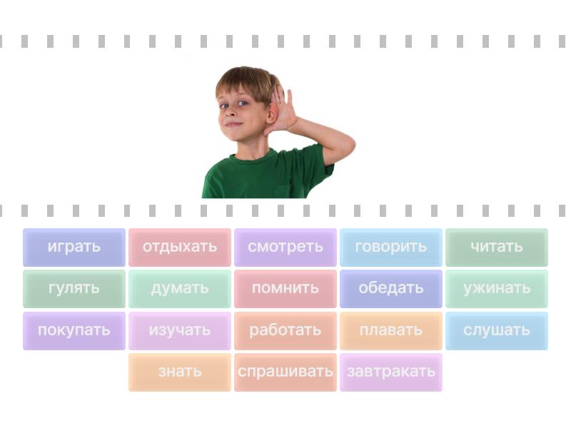 слушать, отдыхать, знать, читать, изучать, играть, думать, работать, смотреть, говорить, помнить, плавать, гулять, завтракать, обедать, ужинать, спрашивать, покупать,
