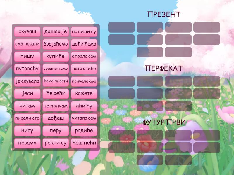 ПРЕЗЕНТ: читам, дођеш, јеси, нису, певамо, кажете, пишу, не причам, скуваш, перу, ПЕРФЕКАТ: читала сам, дошао је, попили су, писали сте, смо певали, рекли су, средили смо, причале смо, је скувала, опрала сам, ФУТУР ПРВИ: доћи ћемо, ће рећи, ићи ћу, ћеш пећи, радиће, ћемо писати, ћете отићи, бројаћемо, путоваћу, купиће,