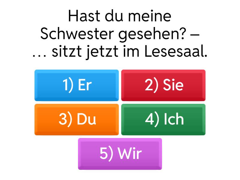 1) Hast du meine Schwester gesehen? – … sitzt jetzt im Lesesaal. a) 1) Er b) 2) Sie c) 3) Du d) 4) Ich e) 5) Wir 2) Hast du einen Computer? – Nein, ich habe … Computer zu Hause. a) 1) keines b) 2) kein c) 3) keinem d) 4) keinen e) 5) keiner 3) „Monika und Gisela, … bitte eure Arbeiten ab!“ a) 1) gib b) 2) gibt c) 3) gebe d) 4) geben e) 5) gebt 4) Dieses Projekt hatte keinen Erfolg. – Ja, es war wirklich erfolg… . a) 1) -sam b) 2) -lich c) 3) -ig d) 4) -reich e) 5) -los 5) Viele Schüler bekommen zu Hause kein Mittagessen oder gehen nach der Schule nicht nach Hause, (A11) … sie am Nachmittag Unterricht haben. a) 1) denn b) 2) damit c) 3) dass d) 4) weil e) 5) aber 6) Der Verein „Frankfurter Tafel“ will nun Schulkindern in der Mittagszeit eine warme Mahlzeit bieten, (A12) … sucht er Restaurants und Gaststätten, die für Schüler kochen werden.  a) 1) denn b) 2) und c) 3) aber d) 4) ob e) 5) darum 7) Sie möchten einen Arzt konsultieren. Sie rufen ihn an und fragen: … a) 1) Wann haben Sie Ihren Termin?  b) 2) Wann empfangen Sie Gäste? c) 3) Wann haben Sie Ihre Sprechstunden? d) 4) Wann haben Sie Ihr Training? e) 5) Wann haben Sie Ihren Besuch? 8) Unsere Lehrerin ist nicht da, weil … krank ist. a) 1) er b) 2) sie c) 3) es d) 4) ihr e) 5) wir 9) Hat er ein Haus? – Nein, er hat … Haus. a) 1) keines b) 2) keinen c) 3) kein d) 4) keine e) 5) keiner 10) … doch nicht so grob, wenn du mit der Schwester redest! a) 1) Sei b) 2) Seid c) 3) Seien Sie d) 4) Seist e) 5) Sein 11) Meine Mutter ist sehr spar… . a) 1) -ig b) 2) -los c) 3) -sam d) 4) -lich e) 5) -isch 12) Alle (A5) … sich auf den Mai. Draußen ist alles wieder grün und es wird wieder wärmer. a) 1) freue b) 2) freust c) 3) freuen d) 4) freut e) 5) freute 13) Je nach Region (A6) … es unterschiedliche Bräuche. Schon am Vorabend des 1. Mai wird der Maibaum geschmückt. a) 1) gibt b) 2) gebe c) 3) gebt d) 4) gibst e) 5) geben 14) Eine kleine Birke (A7) … mit bunten Bändern geschmückt. Wenn man den Maibaum aufgestellt hat, wird gefeiert. a) 1) wurde b) 2) wirst c) 3) werde d) 4) werdet e) 5) wird 15) Und in den Dörfern und Städten findet auch fast immer der „Tanz in den Mai“ statt. Bis spät in die Nacht hinein (A8) … man dann tanzen und feiern. a) 1) wollen b) 2) sollst c) 3) müssen d) 4) kann e) 5) können 16) Lieber macht man mit der Familie einen Ausflug oder eine Wanderung. In manchen Gegenden (A10) … man gemeinsame Umzüge und Ausflüge oder auch Maifeste mit Musik. a) 1) gibt b) 2) organisiert c) 3) ist d) 4) bekommt e) 5) tanzt 17) Im Südwesten von der Stadt Garmisch-Partenkirchen liegt Deutschlands höchster Berg – die Zugspitze. Von oben ist ein tolles Alpenpanorama zu sehen. Es ist logisch, (A11) … viele Touristen die Stadt besuchen. a) 1) dass b) 2) und c) 3) weil d) 4) denn e) 5) darum 18) Die Stadt ist nicht groß, (A12) … man kann hier viel Interessantes sehen. a) 1) weil b) 2) aber c) 3) dass d) 4) oder e) 5) ob