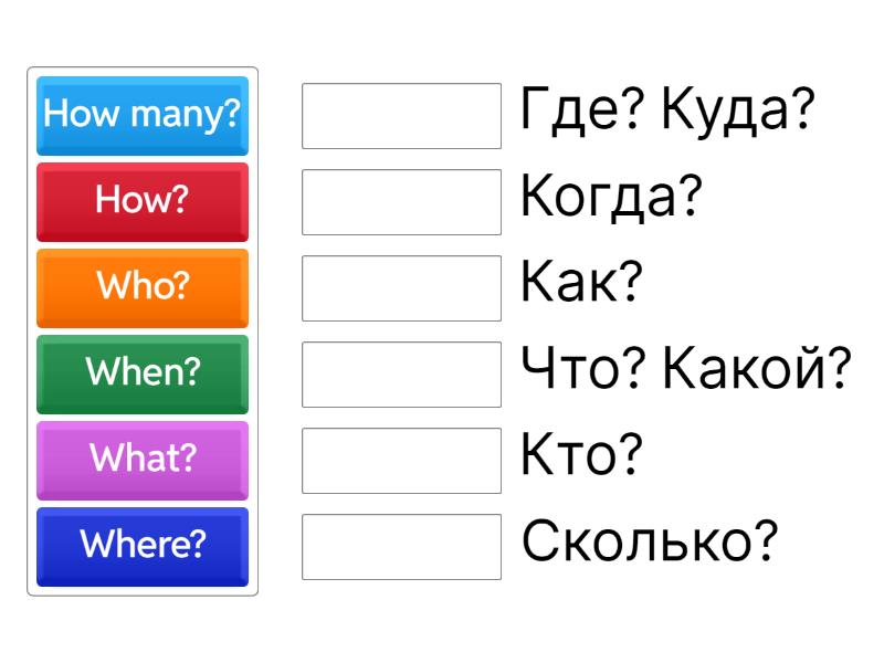 What? -  Что? Какой?, How? - Как?, Where? - Где? Куда?, Who? - Кто?, How many? - Сколько?, When? - Когда?,