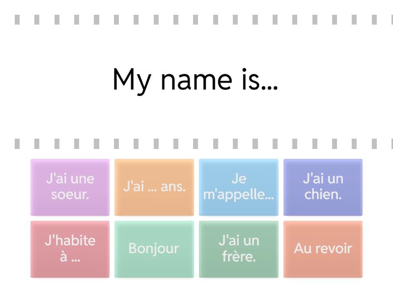 Je m'appelle... - My name is..., J'habite à ... - I live in ..., J'ai ... ans. - I am ... years old., J'ai un frère. - I have a brother. , J'ai une soeur. - I have a sister, J'ai un chien. - I have a dog. , Bonjour - Hello, Au revoir - Goodbye,