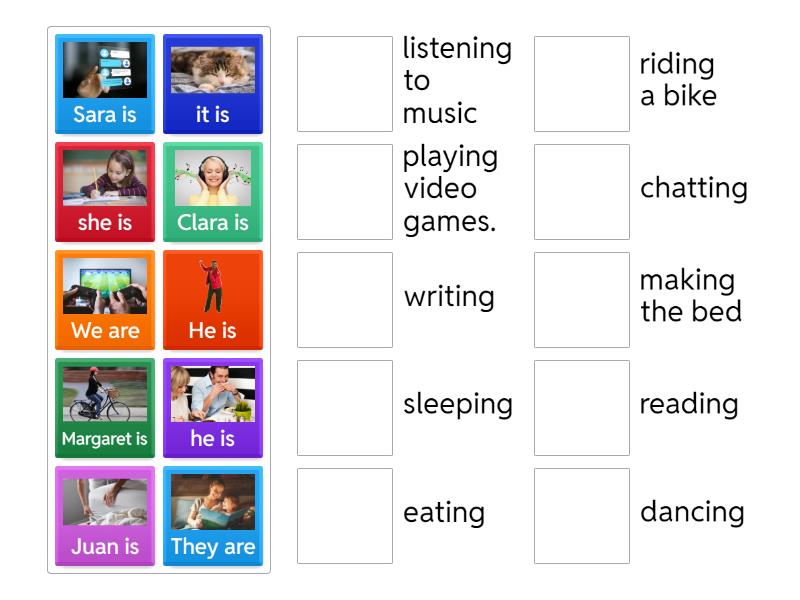 He is  - dancing , They are - reading , We are  - playing video games., she is  - writing , Clara is  - listening to music , Sara is  - chatting, Juan is  - making the bed, he is  - eating, Margaret is  - riding a bike, it is - sleeping,