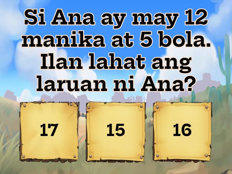 1) Si Ana ay may 12 manika at 5 bola. Ilan lahat ang laruan ni Ana? a) 17 b) 15 c) 16 2) Ang tatay ay nagtanim ng 9 na puno ng mangga at 6 na puno ng buko. Ilan puno ang tanim ni Tatay? a) 11 b) 15 c) 14 3) May 8 batang babae at 9 na batang lalaki ang lumahok sa paligsahan ng pag-awit. Ilan lahat ang lumahok sa paligsahan? a) 15 b) 14 c) 17 4) Ang guro ay namigay ng 4 na libro at 5 lapis sa bawat mag-aaral. Ilan gamit sa paaralan ang ibinigay ng guro sa bawat bata? a) 11 b) 9 c) 10 5) Si Nanay ay may 6 na rosas at 7 sunflower sa kanyang hardin. Ilan lahat ang bulaklak ni Nanay sa kanyang hardin? a) 13 b) 12 c) 11