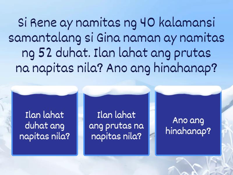 1) Si Rene ay namitas ng 40 kalamansi samantalang si Gina naman ay namitas ng 52 duhat. Ilan lahat ang prutas na napitas nila? Ano ang hinahanap? a) Ilan lahat duhat ang napitas nila? b) Ilan lahat ang prutas na napitas nila? c) Ano ang hinahanap? 2) Si Rene ay namitas ng 40 kalamansi samantalang si Gina naman ay namitas ng 52 duhat. Ilan lahat ang prutas na napitas nila? Ano ang given? a) 45 kalamansi at 52 duhat b) 40 kalamansi at 52 duhat c) 40 duhat at 52 kalamansi 3) Si Rene ay namitas ng 40 kalamansi samantalang si Gina naman ay namitas ng 52 duhat. Ilan lahat ang prutas na napitas nila? Ano ang operasyon na gagamitin? a) Subtraction b) Multiplication c) Addition 4) Si Rene ay namitas ng 40 kalamansi samantalang si Gina naman ay namitas ng 52 duhat. Ilan lahat ang prutas na napitas nila? Ano ang mathematical sentence? a) 52+40= b) 45+52= c) 40+52= 5) Si Rene ay namitas ng 40 kalamansi samantalang si Gina naman ay namitas ng 52 duhat. Ilan lahat ang prutas na napitas nila? Ano ang sagot? a) 92 prutas b) 92 duhat c) 92 kalamansi