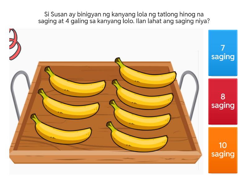1) Si Susan ay binigyan ng kanyang lola ng tatlong hinog na saging at 4 galing sa kanyang lolo. Ilan lahat ang saging niya? a) 7 saging b) 8 saging c) 10 saging 2) Si nanay ay namitas ng tatlong talong kahapo, tatlong talong ngayon at tatlong talong kanina. Ilan lahat ang talong na napitas ni nanay? a) 6 talong b) 9 talong c) 8 talong 3) Si Ned ay may limang batik na holen at apat na asul na holen. Ilan lahat ang holen ni Ned? a) 8 holen b) 10 holen c) 9 holen 4) Si Enod ay mahilig sa mga ibon. Araw araw pinapakain niya ang 6 na maya at 6 na parot. Ilan lahat ang ibong alaga niya? a) 11 ibon b) 12 ibon c) 10 ibon 5) Si ate ay nagluto ng 5 cupcake kahapon at 5 cupcake ngayun. Ilan lahat ang nilutong cupcacke ni ate? a) 9 cupcake b) 8 cupcake c) 10 cupcake
